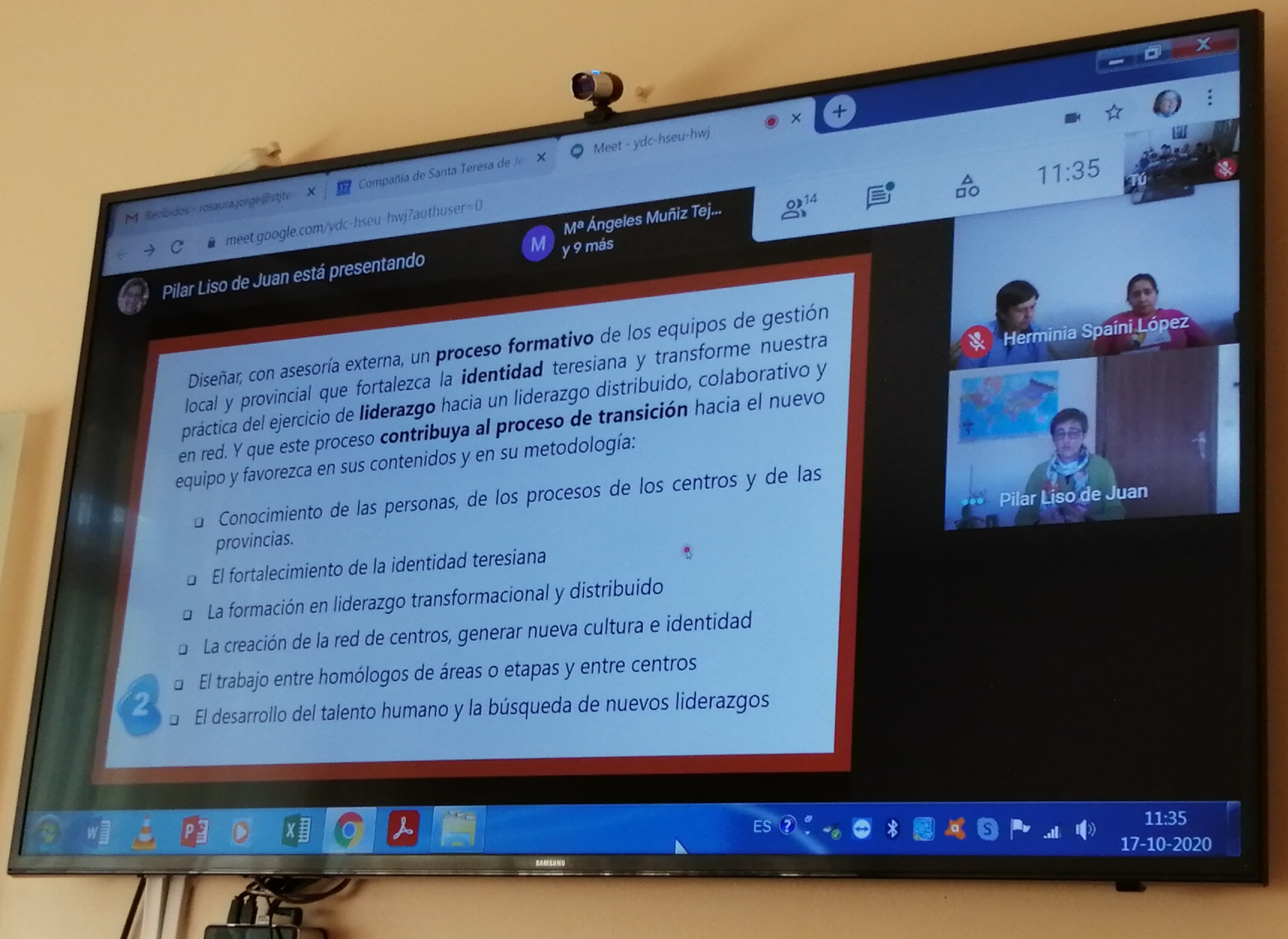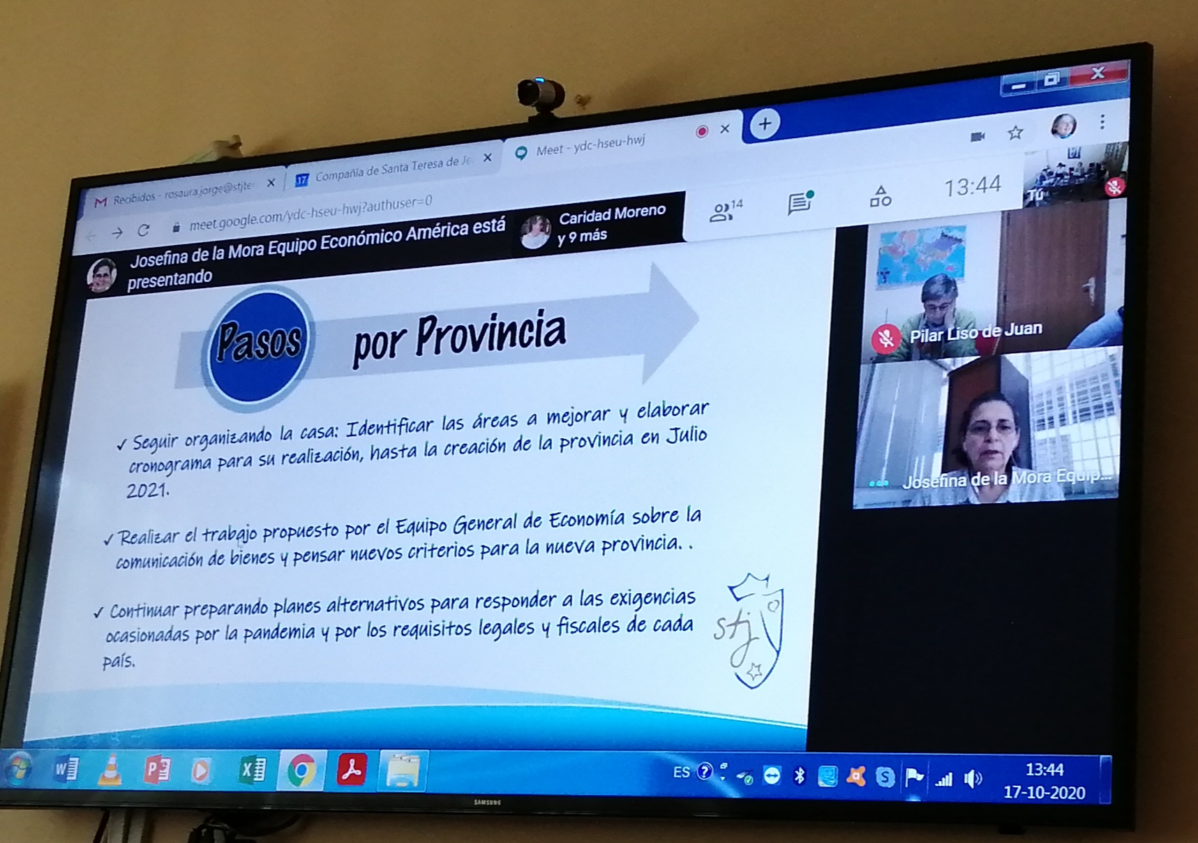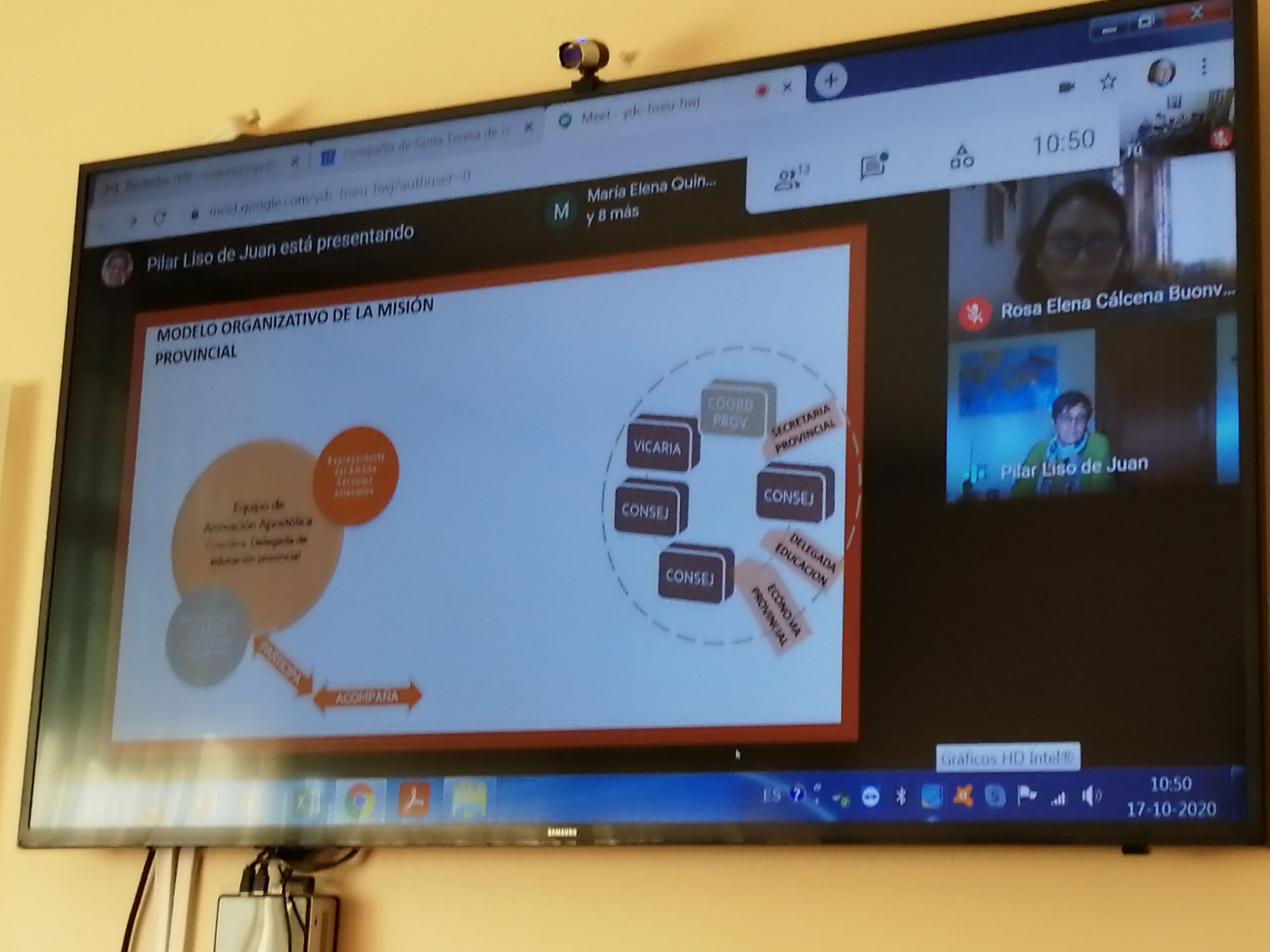 Después de un merecido descanso la Hna. Pilar Liso, en representación del ECETE (Equipo Continental de Educación Teresiana), nos presentó el modelo de misión, es decir, una posible estructura organizativa a este nivel en la nueva provincia. Al llegar al aspecto económico se unió al encuentro la Hna. Josefina de la Mora, coordinadora del Equipo económico continental (ECECO). Josefina, nos presentó el posible modelo económico. Después de cada presentación se nos invitó a darnos un tiempo para escribir, en una pauta, nuestros sentimientos, resonancias, dudas… y al final, pudimos compartir nuestras resonancias y valoración de lo presentado.